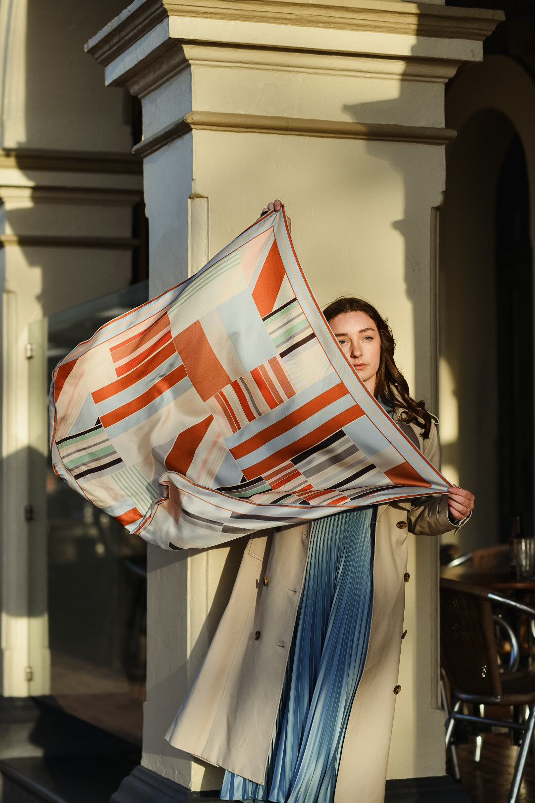 This scarf lifts any outfit to the next level. Can be worn with blue or rust or beige