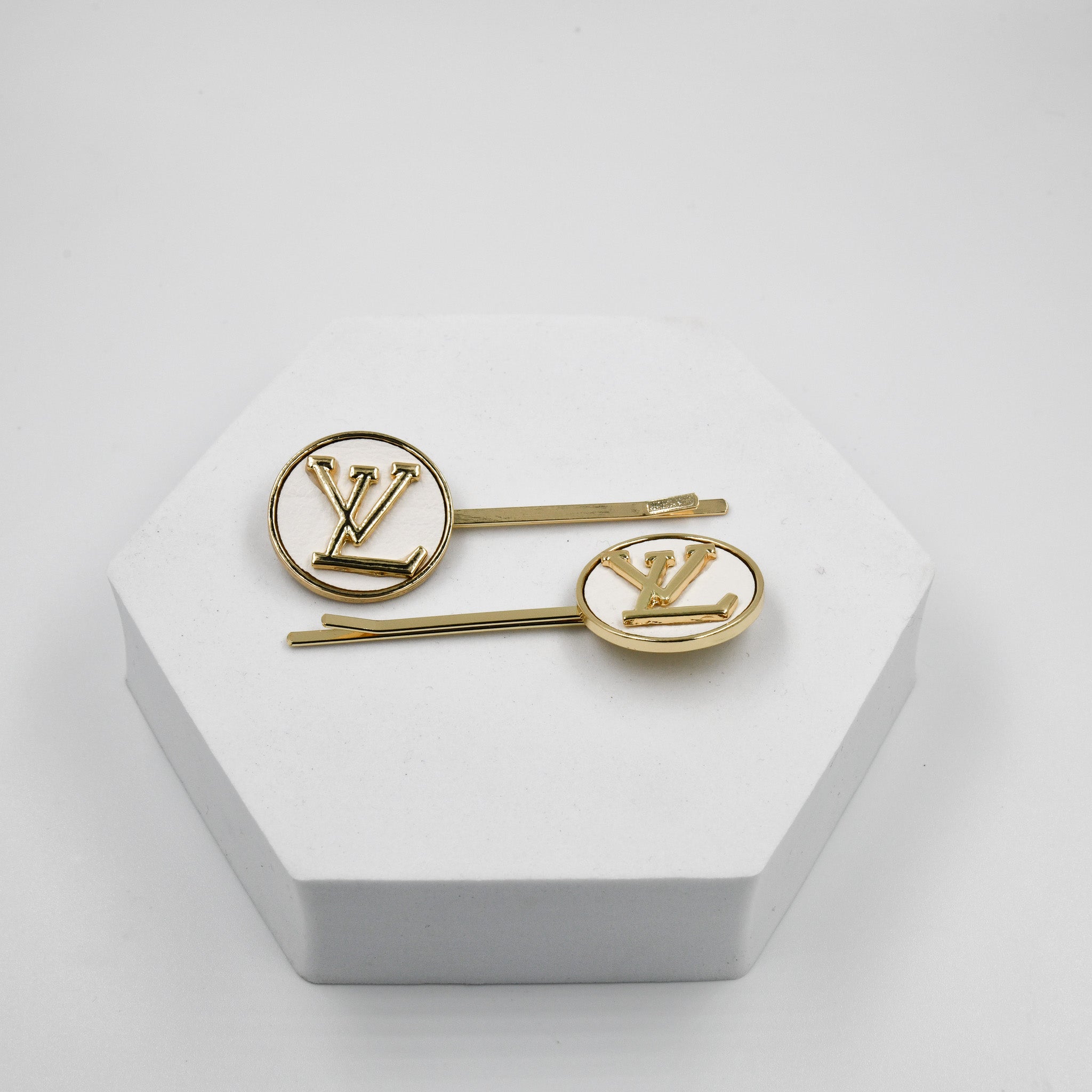 Enhance your style with VL Round Clips. Crafted with elegant gold accents, these classic and timeless clips will add a touch of sophistication to any look. Made with premium White leather backing for a luxurious feel and measuring 7cm, they are both functional and fashionable. Elevate your ensemble with VL Round Clips.